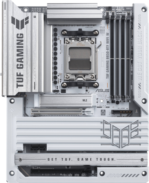 TUF GAMING B850-BTF WIFI W берет все основные элементы новейших процессоров AMD Ryzen и сочетает их с готовыми к игре функциями и проверенной долговечностью. «BTF» означает «Назад в (будущее)», что означает новую эру для всех геймеров PC DIY; передовая серия BTF не только скрывает все свои разъемы на нижней стороне материнской платы, но и обеспечивает до 600 Вт для видеокарт BTF через слот повышенной мощности для графической карты, что обеспечивает чистый кабель-менеджмент и минималистичный внешний вид сборки. Эта платформа обеспечивает мощность и возможности подключения, которые требуются передовым приложениям для ПК с искусственным интеллектом.