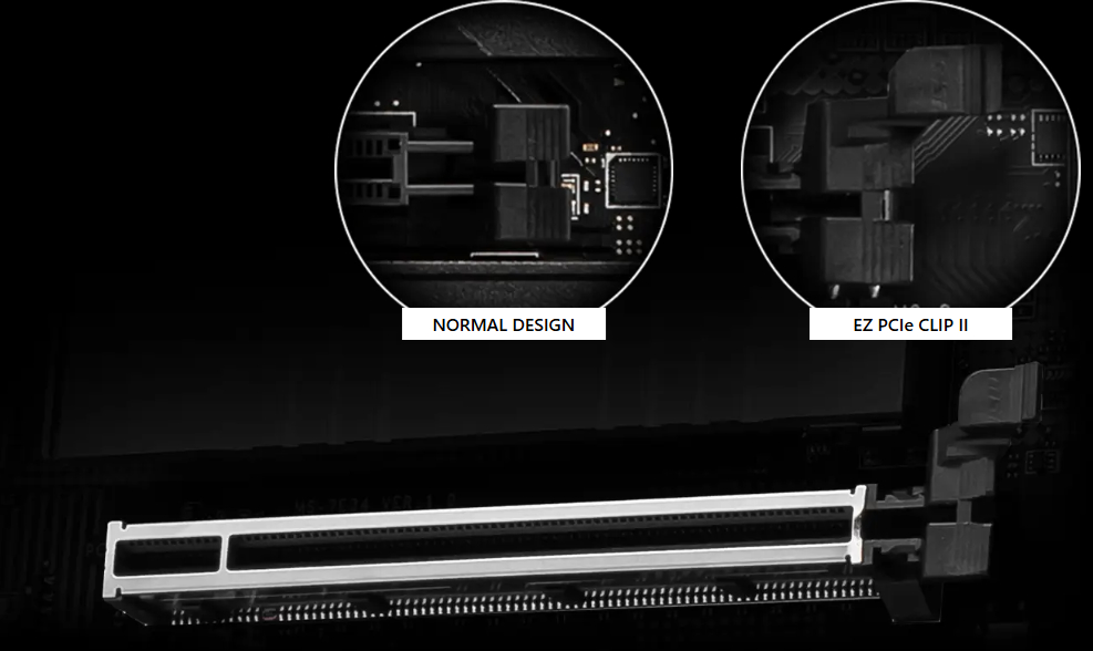 Новый фиксатор EZ PCIe Clip II, установленный на первом слоте, оснащен механизмом отскока, который позволяет легко вынуть видеокарту, нажав на хвостообразный замок одним пальцем. Благодаря такой конструкции пользователи могут без особых усилий вынимать видеокарты даже в условиях ограниченного пространства корпуса.