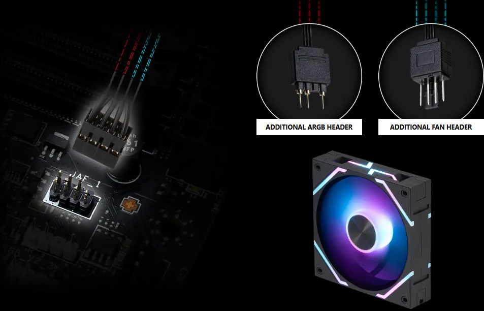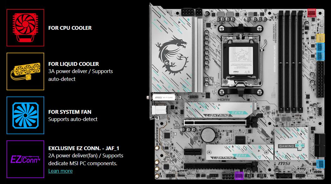 Эксклюзивный разъем MSI JAF_1 позволяет подключить несколько вентиляторов MPG EZ120 ARGB с помощью одного кабеля. Кроме того, разъем JAF_1 можно превратить в дополнительные разъемы ARGB Gen 1 и типового разъема для вентиляторов с помощью специального адаптера 1 to 2 EZ Conn.