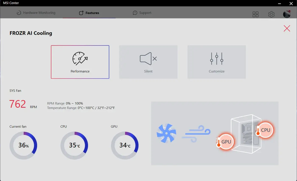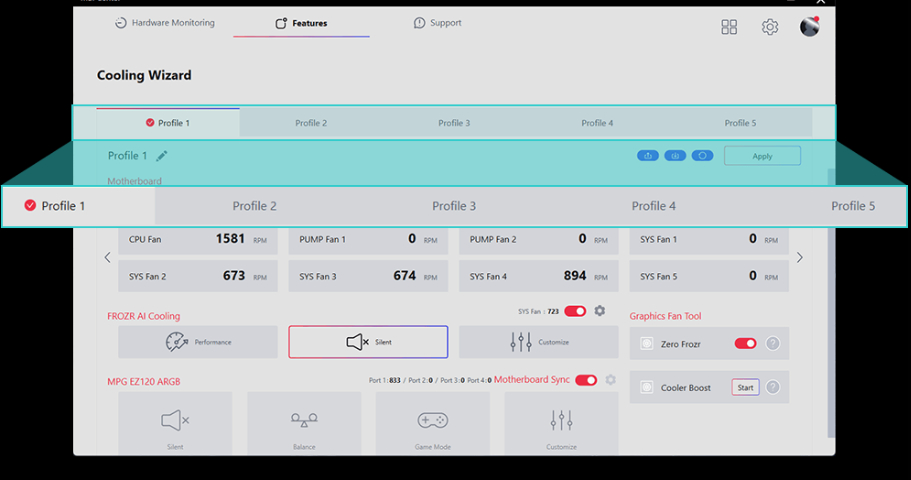 Cooling Wizard - это комплексное решение для управления настройками вентиляторов во всех продуктах MSI. Он обеспечивает превосходную производительность охлаждения и снижение уровня шума для вашего игрового ПК, предлагая совместимость с вентиляторами и насосами, управляемыми PWM/DC, а также интуитивно понятный мониторинг температуры.