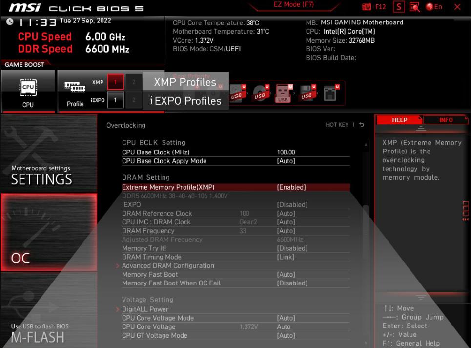 - XMP: выберите один из предустановленных профилей XMP и автоматически разгоните совместимую память DDR.