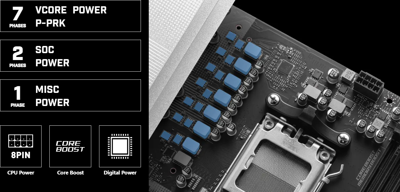 Высококачественные термопрокладки MOSFET мощностью 7 Вт/мК и дополнительные дроссели обеспечивают стабильную производительность при работе всех ядер на высокой скорости.