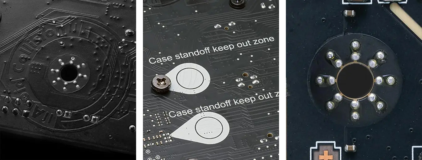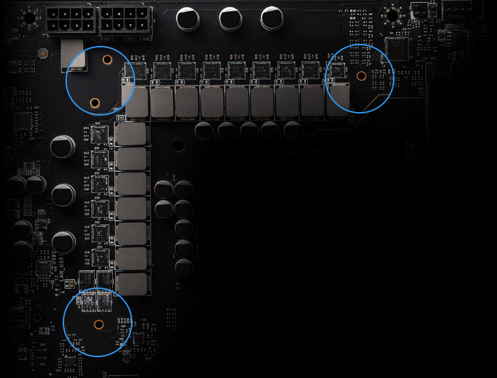 Структура заземления фаз питания является эксклюзивной разработкой MSI. Эта запатентованная конструкция позволяет подавлять электромагнитные помехи (ЭМП), генерируемые силовыми фазами, и помогает эффективно отводить тепло к медной плоскости с заземляющими свойствами.