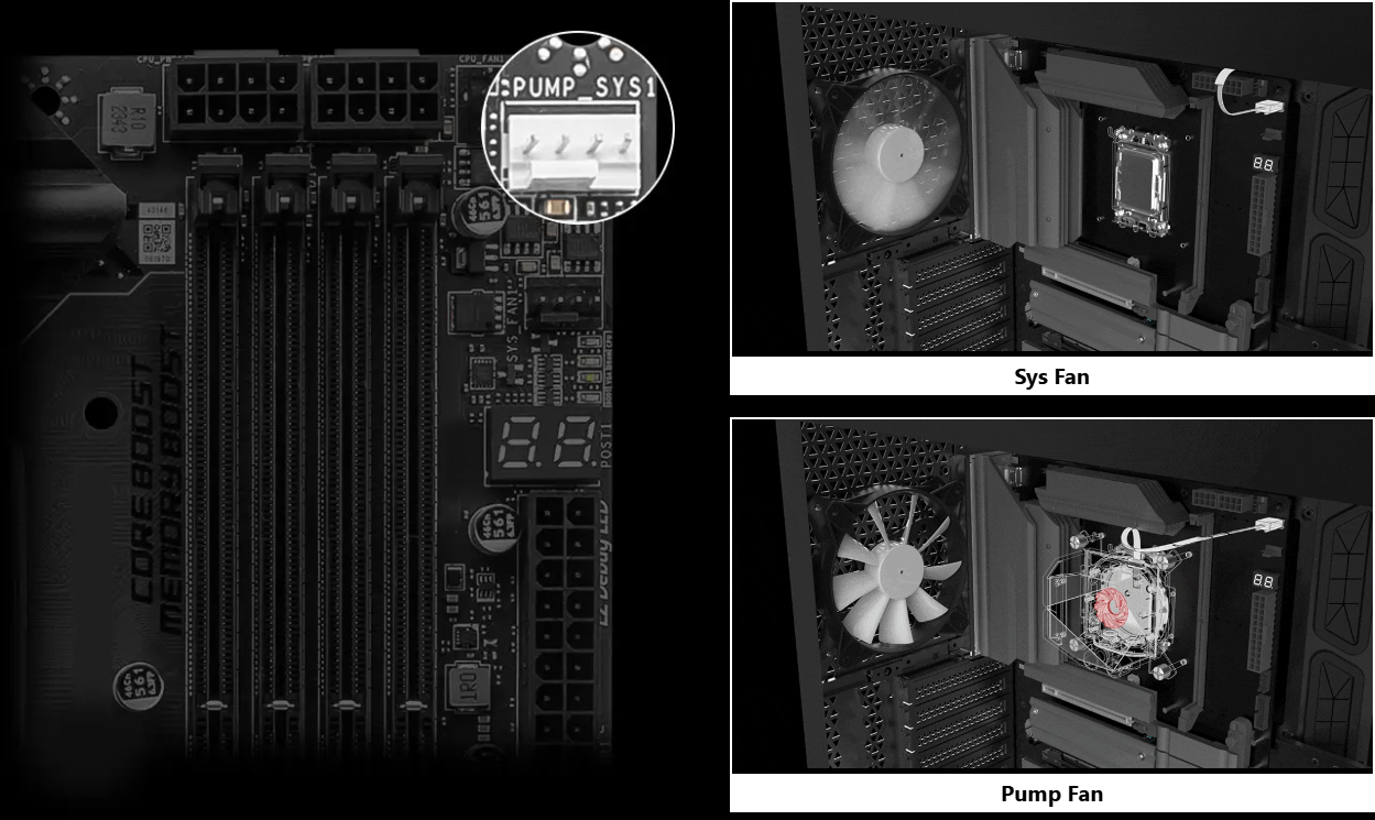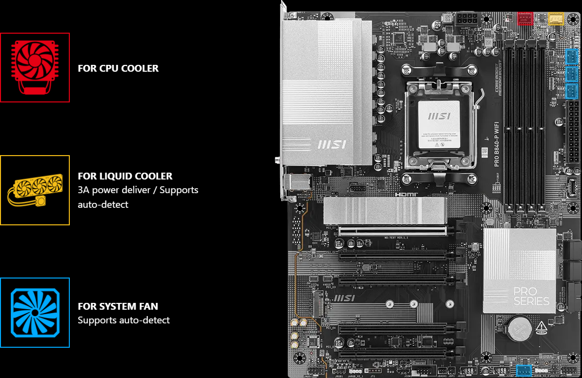 Подключение и синхронизация с кулерами и корпусами MSI благодаря стратегически расположенным штырьковым разъемам, включая специальный разъем для вентилятора помпы.