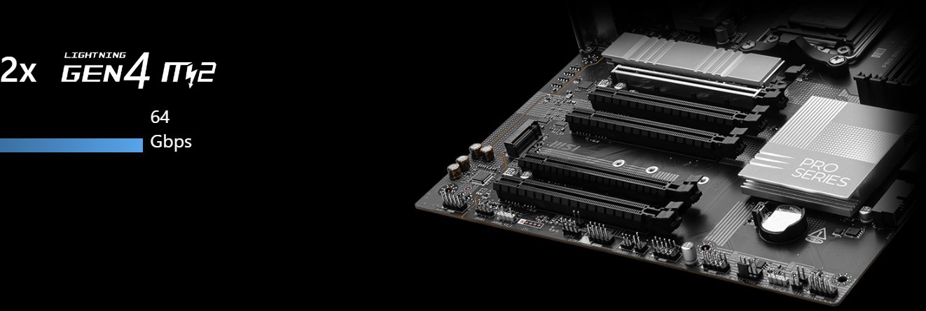 MSI lightning Gen 4 PCI-E - это увеличение пропускной способности интерфейса x16 до 64 ГБ/с, что в два раза больше, чем у предыдущего поколения.