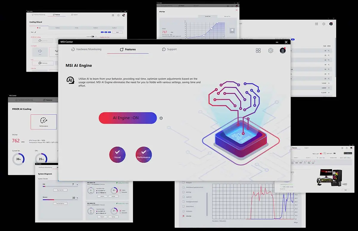 Множество функций внедряют искусственный интеллект в ключевые аспекты вашей работы с компьютером для более разумной оптимизации в режиме реального времени. MSI Center предлагает чистый, минимальный интерфейс для настройки и управления параметрами ПК. AI Engine, например, автоматически регулирует настройки в зависимости от используемых приложений, обеспечивая бесперебойную работу.