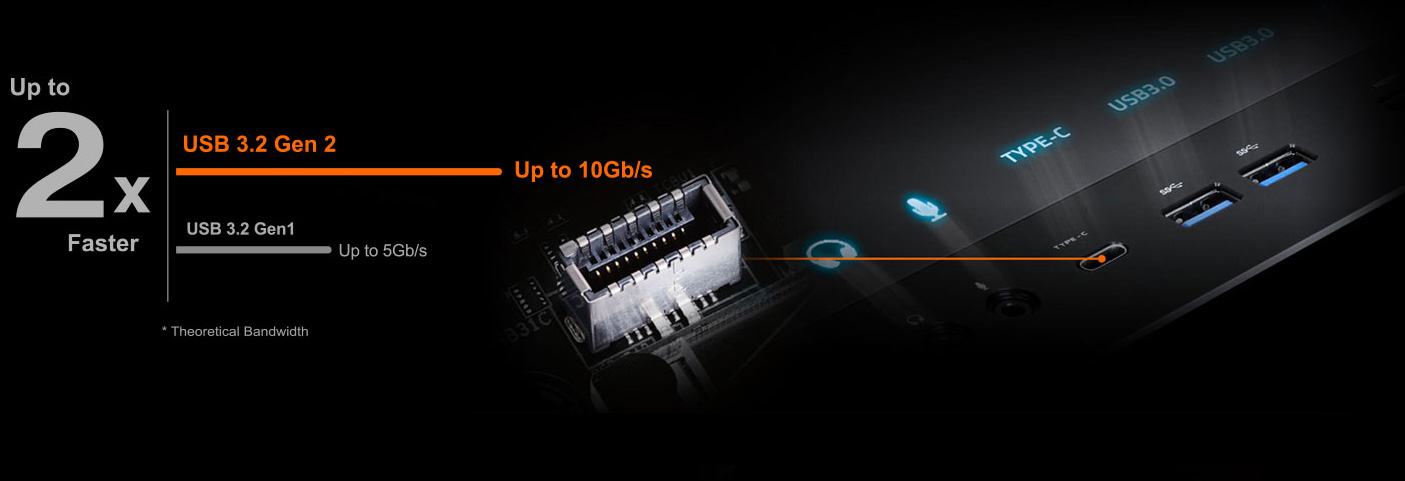 USB 3.2 Gen 2 обеспечивает порты USB 3.2 Gen 2 со скоростью передачи данных до 10 Гбит/с. Благодаря вдвое большей пропускной способности по сравнению с предыдущим поколением, а также обратной совместимости с USB 2.0 и USB 3.2 Gen 1, значительно улучшенный протокол USB 3.2 Gen 2 доступен через новый реверсивный USB Type-C и традиционный разъем USB Type-A для лучшей совместимости с широким спектром устройств.