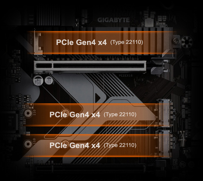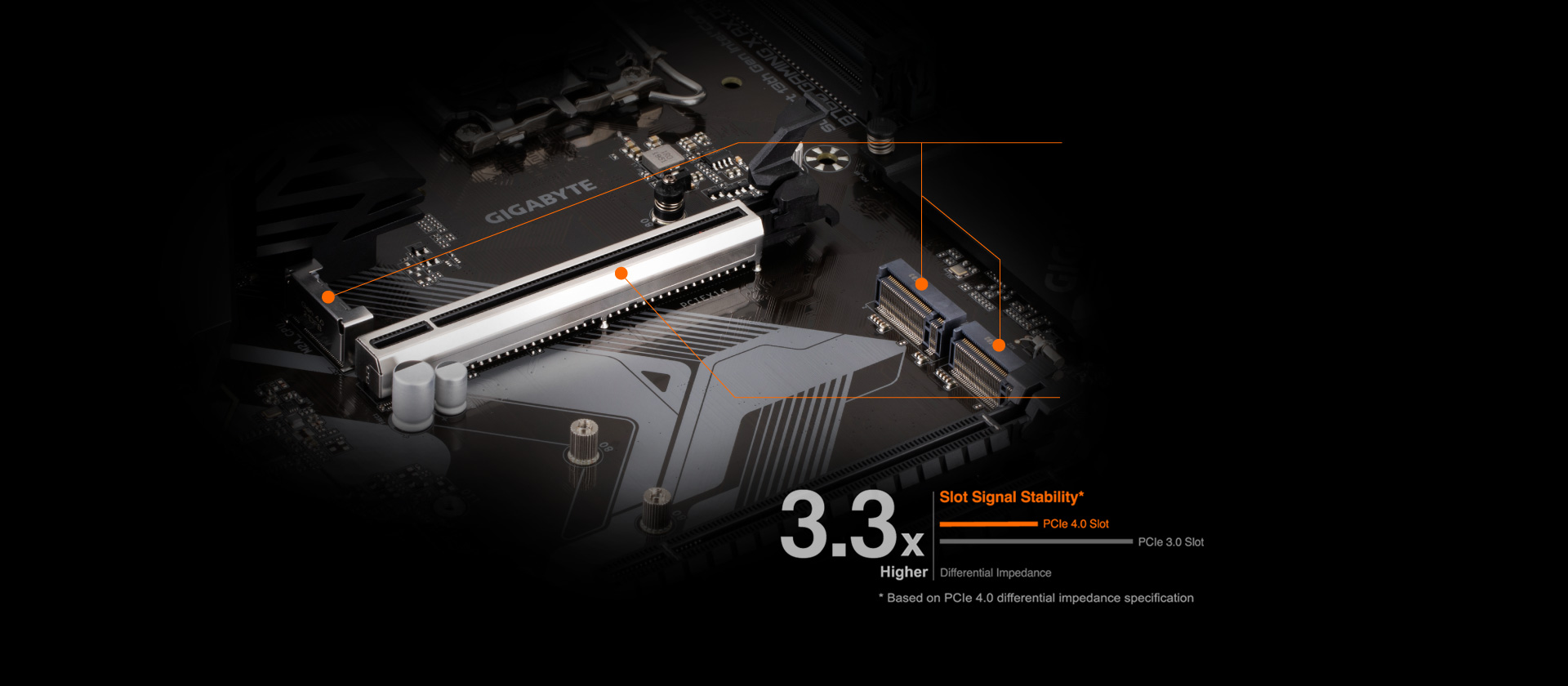 Материнские платы GIGABYTE B760 готовы к работе с устройствами PCIe 4.0, пропускная способность которых, как ожидается, будет втрое выше, чем у существующих устройств PCIe 3.0. Для достижения высоких скоростей и сохранения целостности сигнала в разработках GIGABYTE используется низкоимпедансная печатная плата, обеспечивающая максимальную производительность.