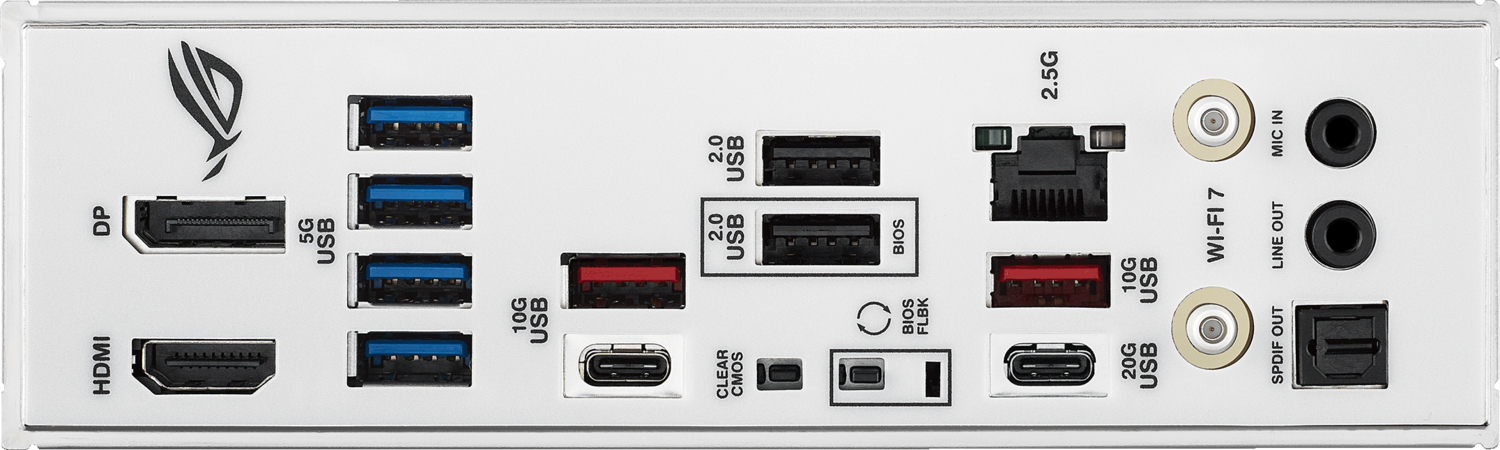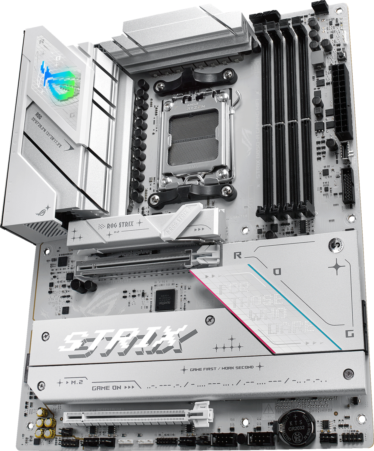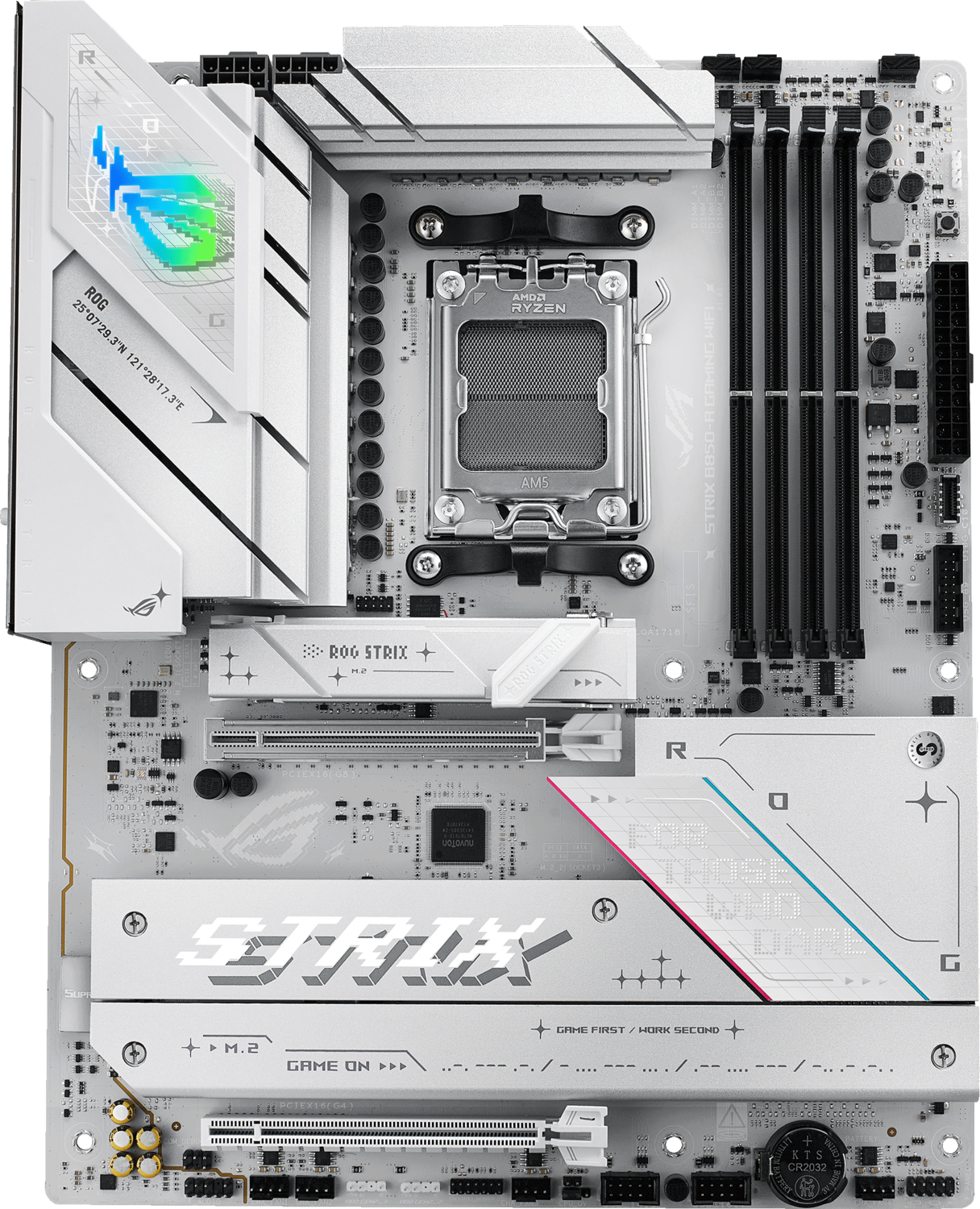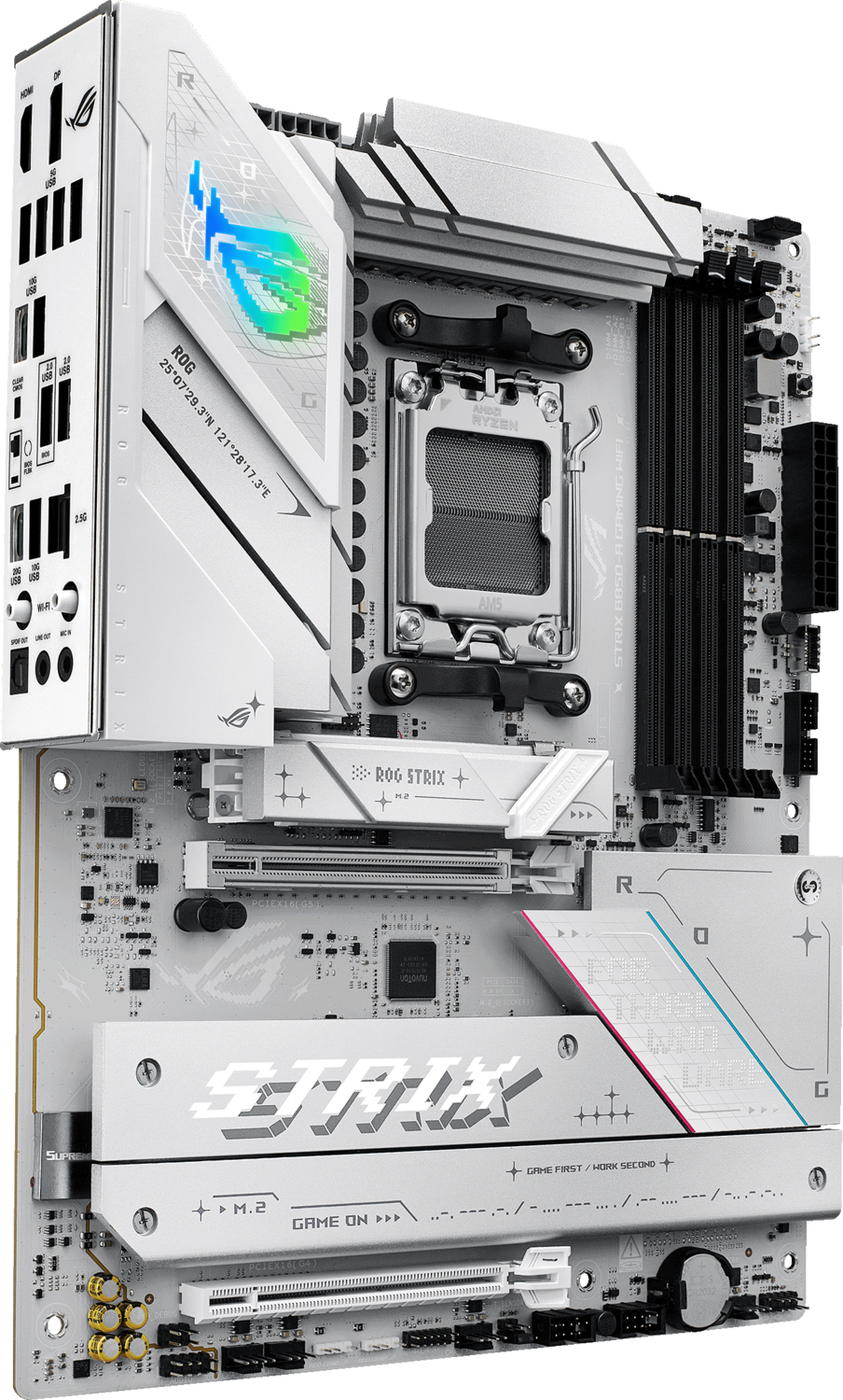 ROG Strix B850-A выделяется своей выразительной белой печатной платой — ее свежий и современный эстетичный вид безупречно дополнит практически любую сборку. Серебристые радиаторы идеально соответствуют такому оформлению, а изящная RGB-подсветка на кожухе интерфейсов делает дизайн платы еще более смелым и ярким.