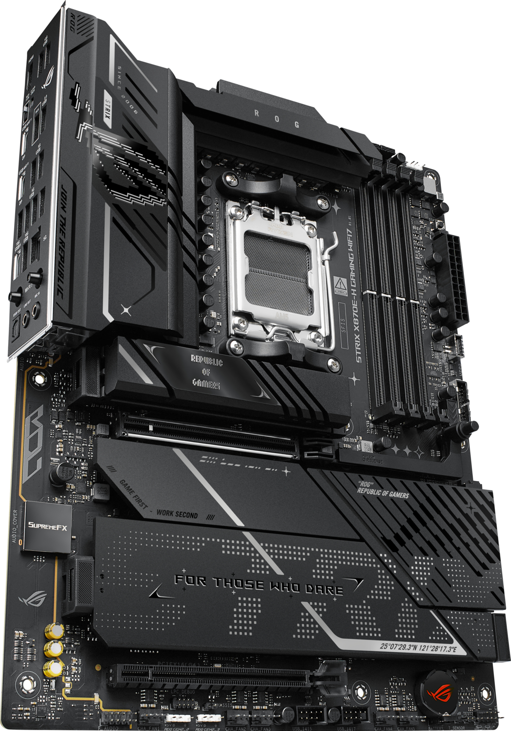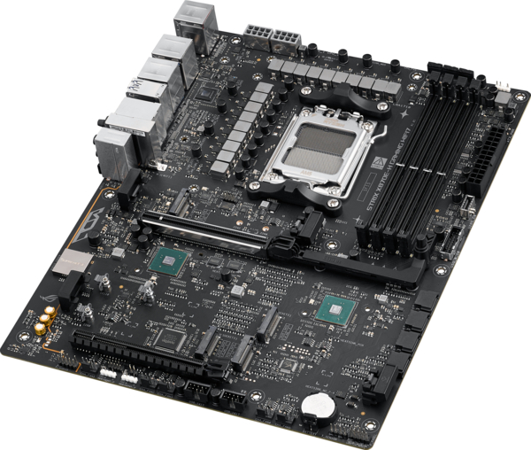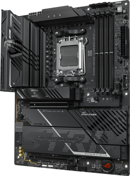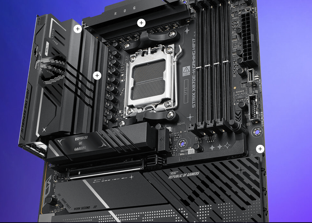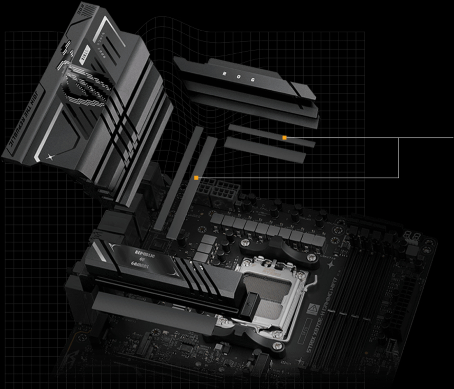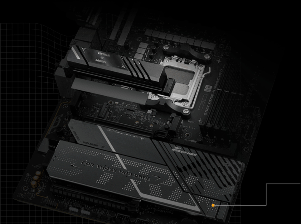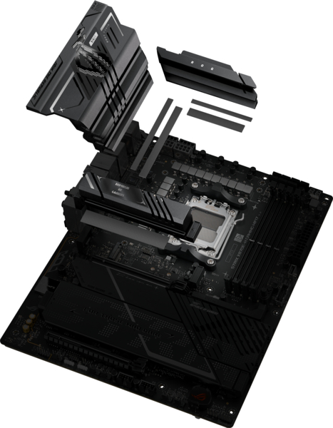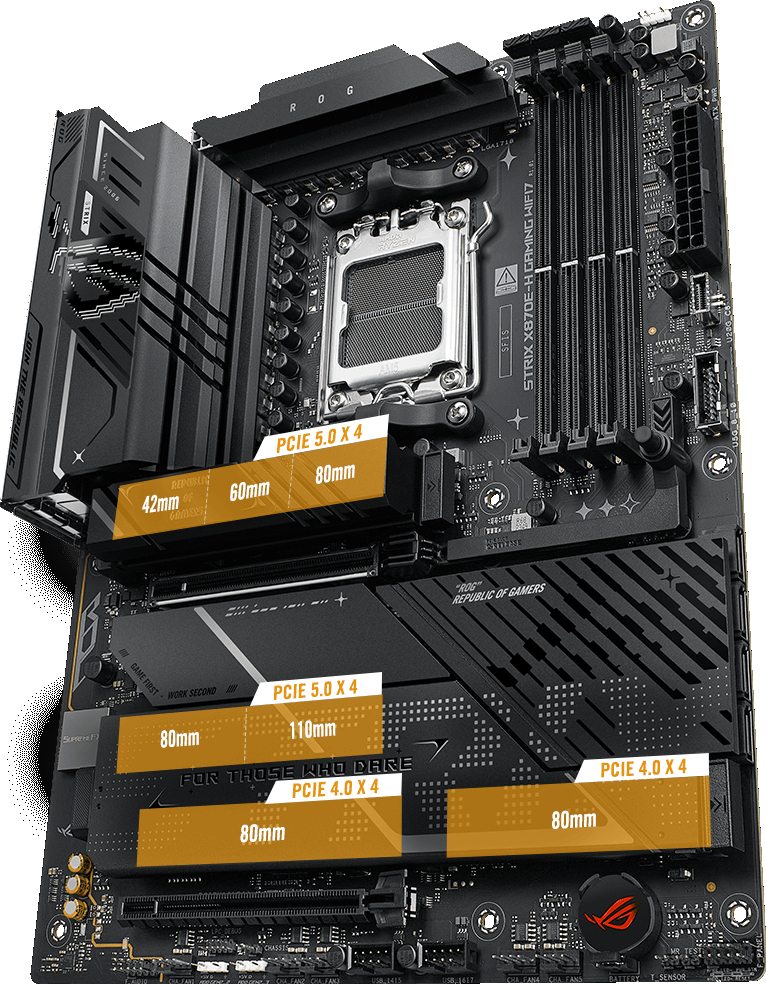 Полностью поддерживая новый стандарт, Strix X870E-H предлагает сквозную поддержку PCIe 5.0. Верхний слот расширения x16 также защищен фиксирующим кронштейном SafeSlot, чтобы выдерживать вес новейших видеокарт. Между тем, два встроенных слота M.2 рассчитаны на впечатляющую скорость чтения и записи 16 ГБ/с, а остальные могут обеспечить все еще впечатляющую скорость передачи данных 8 ГБ/с. Каждый слот M.2 покрыт массивными радиаторами для отвода тепла от накопителей нового поколения.
