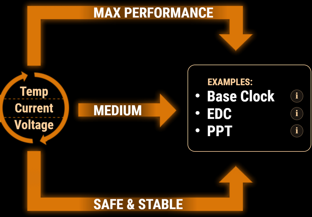 Core Flex позволяет вам преодолевать пределы как никогда раньше, давая вам возможность контролировать тактовую частоту, мощность и температуру новыми творческими способами. В простейшем виде вы можете максимизировать базовую тактовую частоту при небольшой нагрузке и установить точки останова, чтобы постепенно снижать частоту ядра процессора по мере повышения температуры или тока. Но система чрезвычайно адаптивна и поддерживает несколько функций, управляемых пользователем, которые могут независимо манипулировать пределами мощности, тока и температуры, чтобы вы могли настроить производительность процессора по своему усмотрению.