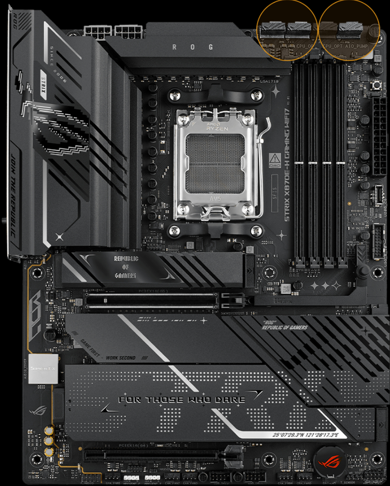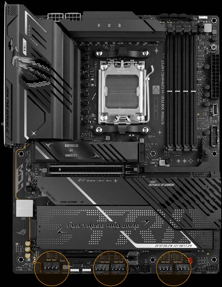 Strix X870E-H имеет пять разъемов для вентиляторов корпуса, каждый из которых поддерживает автоматическое определение вентиляторов PWM или DC.