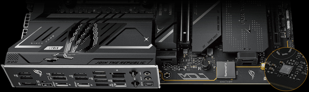 ROG SupremeFX — это уникальное сочетание аппаратных и программных технологий, обеспечивающих превосходное качество звука. В Strix X870E-H используется кодек ALC1220P для воспроизведения высокого разрешения до 32 бит/384 кГц на всех каналах. Выход на передней панели транслируется через встроенный усилитель Savitech, который может передавать высококачественный звук на широкий спектр динамиков и наушников.