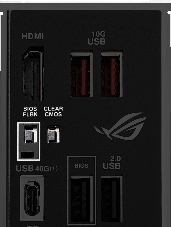 Кнопка Clear CMOS быстро сбрасывает настройки BIOS до заводских значений по умолчанию. Ее также можно использовать для перезагрузки ПК, если были выбраны неправильные настройки BIOS. BIOS FlashBack — это безопасный и простой способ обновления BIOS. Просто скопируйте файл BIOS (UEFI) на USB-накопитель с форматом FAT32, подключите его к порту USB BIOS FlashBack и нажмите кнопку. Обновления можно выполнять даже без установленной памяти или процессора.