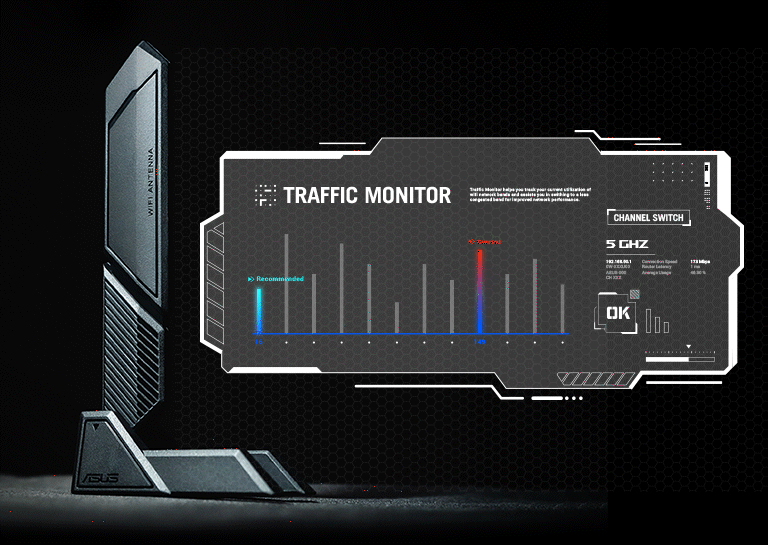 - Traffic Monitor в Armoury Crate отслеживает текущее использование канала WiFi. Перейдите на менее загруженный канал, нажав кнопку «Channel Switch», чтобы улучшить производительность сети.