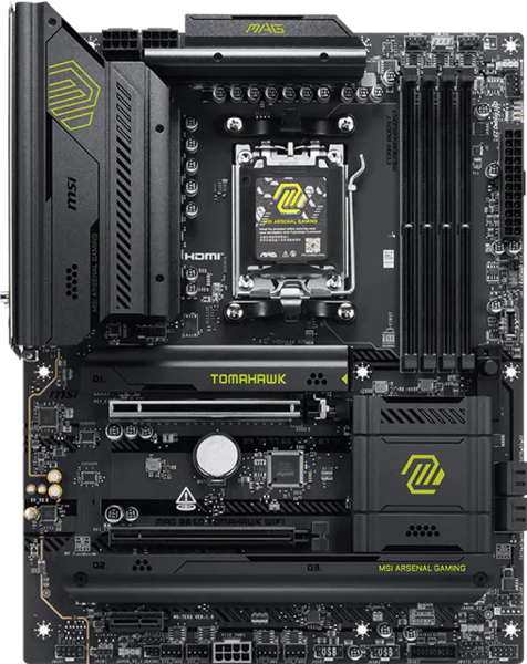 MAG B850 TOMAHAWK WIFI разработана для геймеров, которым нужна стабильная, надежная и удобная для самостоятельной сборки платформа для своих ПК. Благодаря настоящему Wi-Fi 7, 5G LAN, USB 20 Гбит/с, PCIe 5.0, дополнительному питанию PCIe и эксклюзивным функциям EZ DIY, она готова к бою с процессорами AMD Ryzen серии 9000.
