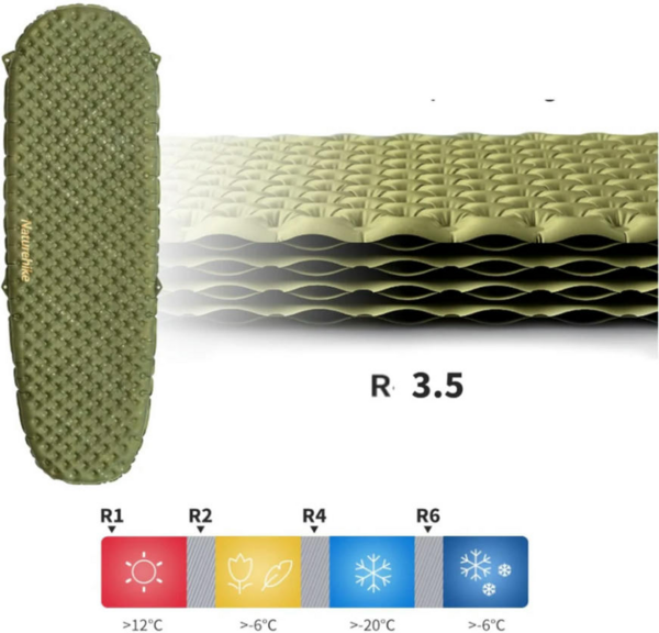 Показатель теплостойкости матраса (R-Value) равен 3.5, поэтому модель можно использовать при температуре воздуха более -6°C. Толщину изделия можно регулировать по своему усмотрению степенью надувания, при этом максимальная толщина достигает 7 см.