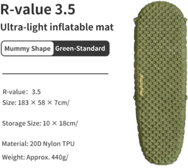 - Матрас надувной сверхлегкий Naturehike CNH22DZ018, овальный зеленый 183 см