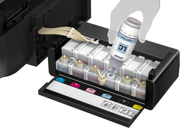 Особенность всех устройств Фабрики печати Epson — это печать без картриджей. Таким образом конструкция Epson L850 предусматривает встроенные емкости для чернил. Оригинальные чернила Epson заправляются во встроенные емкости из контейнеров по 70 мл. Уникальное строение емкостей гарантирует высокое качество печати и надежность работы устройства даже без использования картриджей.