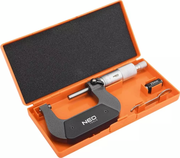 Микрометр Neo отличается высоким качеством изготовления и плавной работой барабана. Благодаря тому, что он оснащен практичной муфтой для прижима элемента, он отлично подойдет для столярных работ. Микрометр комплектуется ключом для обнуления, шаблоном и удобной пластиковой коробкой, позволяющей комфортно хранить инструмент.