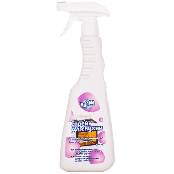 Средство для растворения загрязнений, жира, когти «МИЛАМ – спрей». Предназначен для любых кухонных поверхностей: изразцовых, пластиковых, эмалированных плит, СВЧ – печей, решеток-гриль, полов, раковин, мусорных ведер, столов и прочего.