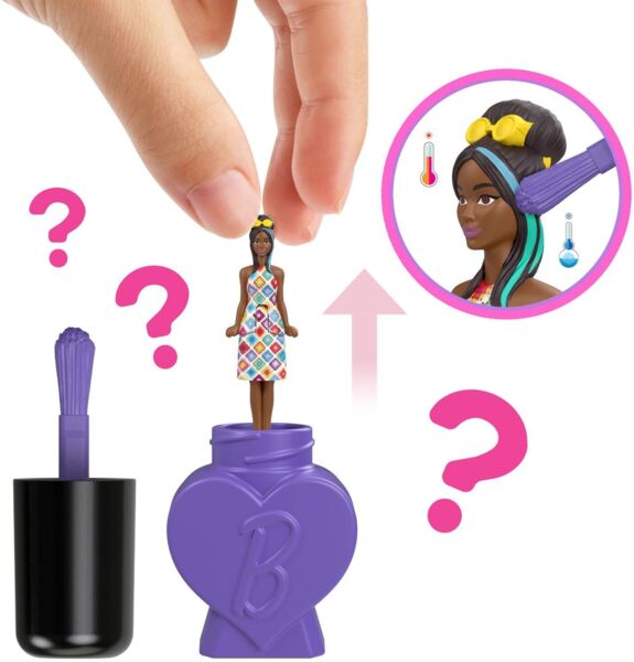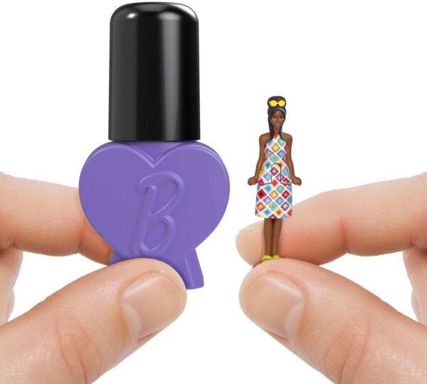 Погрузитесь в увлекательный мир Mini BarbieLand — место, где мечты оживают в миниатюре! Откройте стильный контейнер в виде лака для ногтей и найдите таинственную мини-куклу Барби или Кена. Поверните крышечку, чтобы увидеть своего нового героя — каждая кукла имеет уникальный стиль, напоминающий полноразмерные образы, но в мини-формате! Добавьте магии с помощью кисточки лака: смочите ее водой и измените цвет волос куклы! Мини-куклы гибкие в талии, стоят на подставке в форме сердечка, которая отлично подходит для демонстрации или игры с игровыми наборами Mini BarbieLand (продаются по отдельности). Эти крошечные модницы и модники созданы не только для игры, но и для коллекционеров, желающих создать собственный яркий мини-мир!