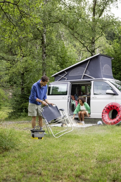 Водяной бак объемом 8 л и встроенный аккумулятор обеспечивают удобную автономную уборку во время путешествий — даже при отсутствии возможности подключения к водопроводу и электросети. Съемный бак можно легко наполнить под краном или из другого источника воды, а герметичный замок позволяет без опасений перевозить его (например, в багажнике автомобиля). Возможность решения множества задач уборки, например очистки велосипедов, садового и туристического инвентаря, мытья собак или детских колясок.