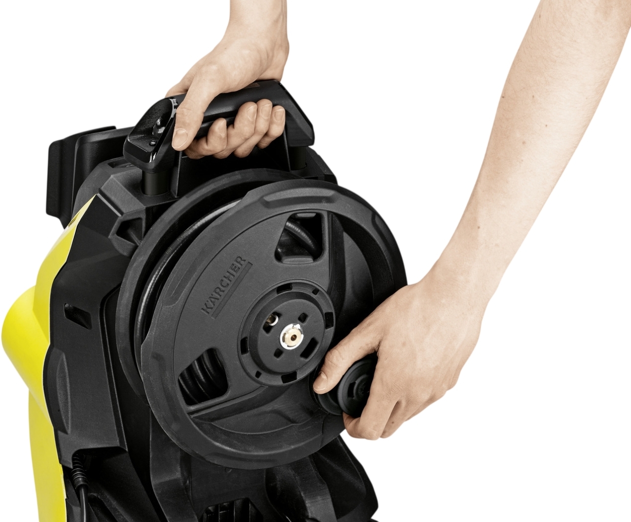 Шланг высокого давления оптимально расположен и защищён от повреждений, также экономит место для хранения. Быстрое и удобное сматывание и разматывание шланга высокого давления. Низкий центр тяжести добавляет аппарату хорошей устойчивости, даже на поверхностях с уклоном.