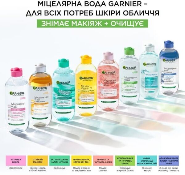 Мицеллярная вода Garnier Skin Naturals - это идеальный выбор для нежного ухода за кожей, особенно для чувствительной. Благодаря инновационной формуле с экстрактом розовой воды, это средство эффективно очищает кожу, удаляя макияж и загрязнения без необходимости сильно тереть. Мицеллы, содержащиеся в составе, мягко растворяют и притягивают частички косметики, грязи и пыли, очищая кожу быстро и без лишних усилий.Розовая вода оказывает смягчающее действие, благодаря чему ваша кожа становится мягкой, эластичной и сияющей.