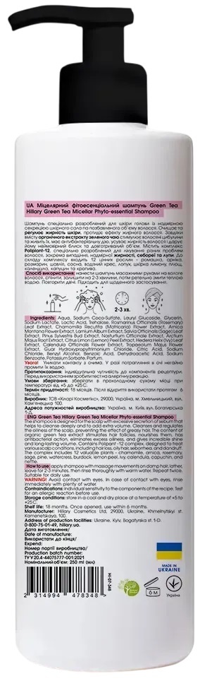 Hillary Green Tea Micellar Phyto-essential Shampoo - шампунь, который нежно очищает волосы и кожу головы, оставляя пряди свежими и легкими.