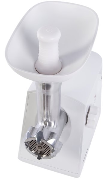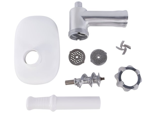 Комплект насадок электромясорубки Panasonic MK-MG1000 включает в себя две решетки с различным диаметром отверстий, загрузочный лоток и толкатель из пластика, а также самозатачивающийся нож из нержавеющей стали. Такого набора вполне достаточно, если вы выбираете технику для качественной переработки мяса в фарш.