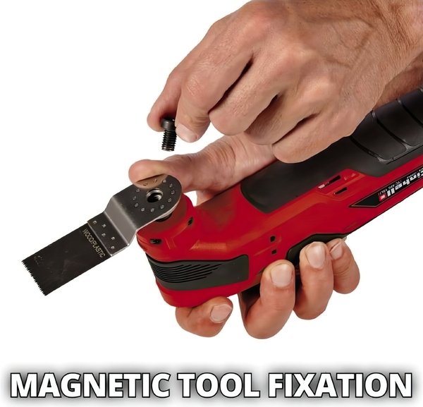 Многофункциональный инструмент аккумуляторный Einhell TC-MG 18 Li-Solo серии Expert classic реноватор справится с любыми задачами: работой по дереву, металлу, пластику, гипсокартону или плитке. Многофункциональный инструмент Einhell TC-MG 18 Li-Solo выполнит множество мелких работ, для выполнения которых раньше требовалось несколько ручных инструментов, он легко справится с пилением, шлифованием или резкой, причем в самых труднодоступных местах и там, где требуется идеальная обработка поверхности. Секрет такой многофункциональности реноватора Einhell TC-MG 18 Li-Solo заключен в вибрационном принципе работы, насадки не вращаются вокруг своей оси, а вибрируют со скоростью 20000 колебаний в минуту под углом ±3.2° . Магнитная фиксация инструмента помогает удерживать неподвижно насадку во время замены. Многофункциональный инструмент Einhell TC-MG 18 Li-Solo благодаря эргономическому дизайну и прорезиненным мягким ручкам удобно лежит в руке, позволяя работать легко, не чувствуя усталости. Инструмент поставляется без аккумулятора и зарядного устройства, но он может быть приведен в действие с помощью Power X-Change аккумулятора.