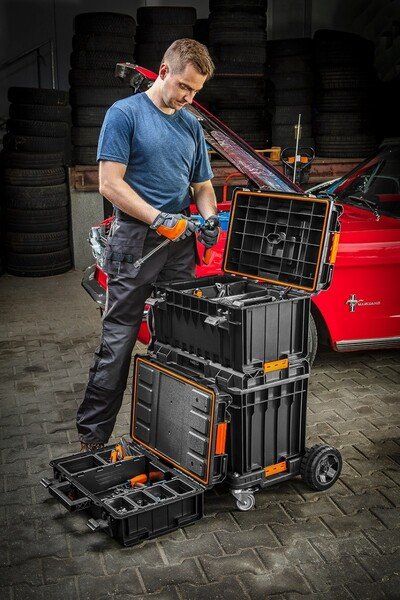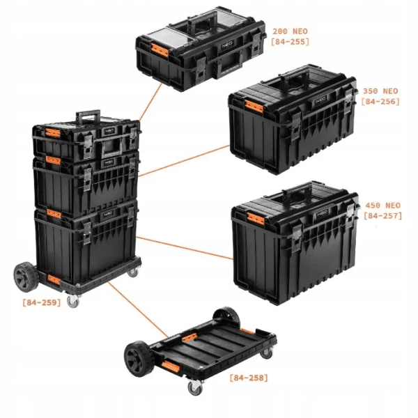 Модульная система, набор NEO (арт.84-259) ― это трехмодульная стабильная конструкция на платформе с колесами, предназначенная для транспортировки и хранения строительного инструмента. Очень крепкая конструкция позволяет перевозить большое количество тяжелого инструмента, а для увеличения рабочего радиуса на крышку можно вставать. Модули имеют множество преимуществ, таких, как регулируемые перегородки, прочные замки, крепкая ручка, крышки с прокладкой, стойкость к воздействию пыли и влаги, глубокие лотки, углубление для резки с линейкой, большая вместимость.