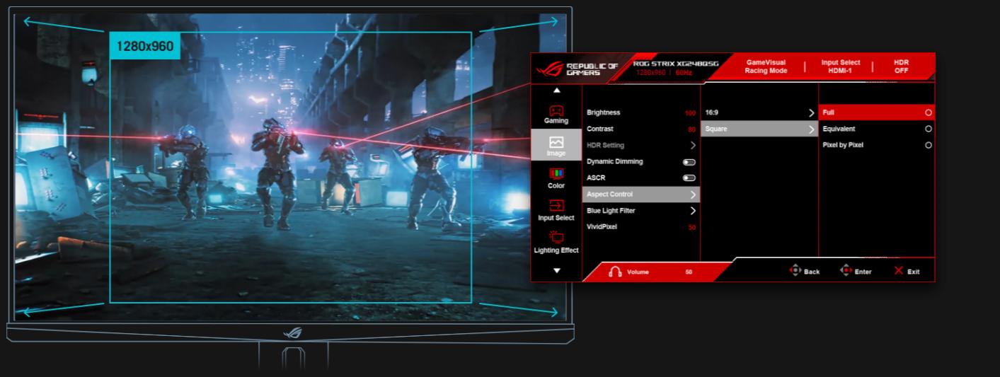 Для геймеров, привыкших к классическим разрешениям, таким как 1280х960 или 1024х768, XG248QSG предлагает удобное управление соотношением сторон непосредственно через меню OSD. Играя в предпочтительном соотношении сторон, монитор помогает сохранить мышечную память и визуальный комфорт геймера.