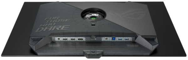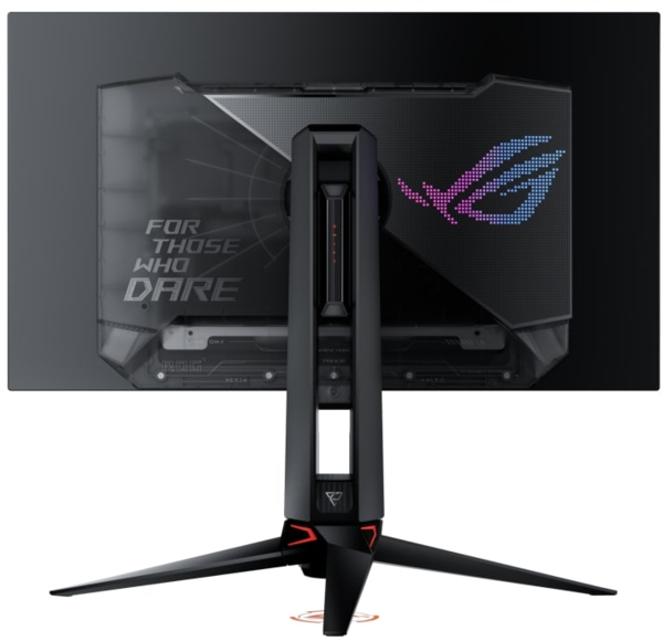 Логотип ROG, проецируемый на подставку монитора, добавляет игровой атмосферы.