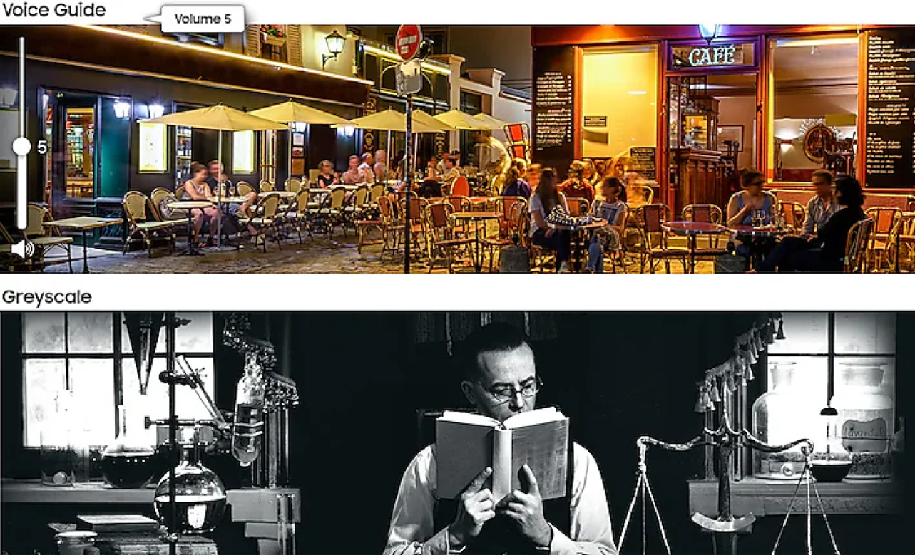Монитор Smart Monitor разработан с учетом требований доступности, особенно для слабовидящих пользователей. Он оснащен инструментами, облегчающими просмотр и использование экрана, включая увеличение экрана, переключение цветов и звуковые описания для таких настроек телевизора, как громкость и канал.