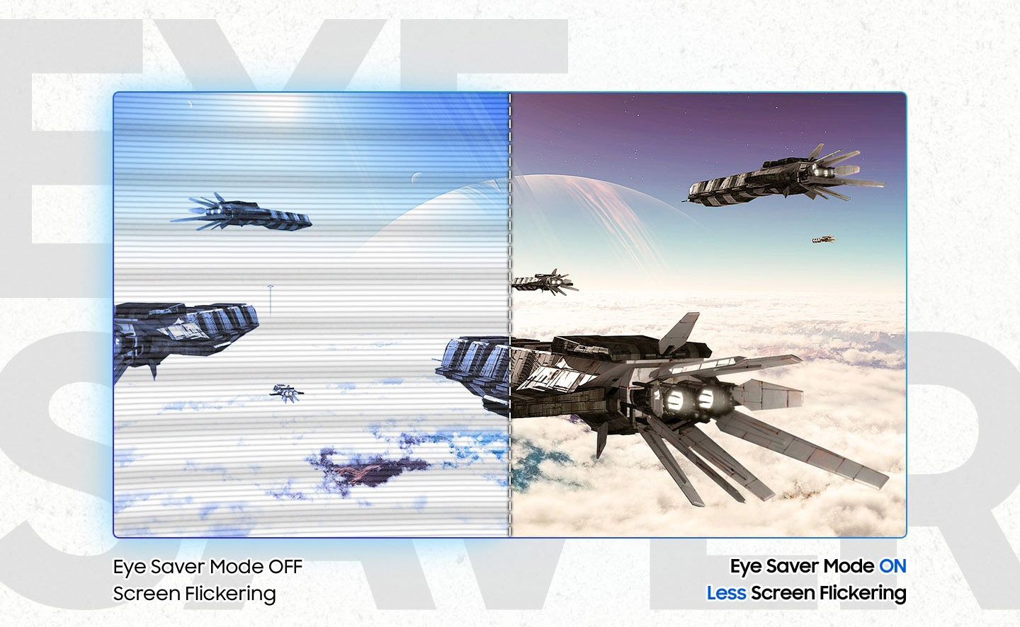 Играйте еще дольше. Режим Eye Saver минимизирует воздействие синего света для комфорта ваших глаз во время длительной игры. Odyssey G5 также уменьшает раздражающее мерцание экрана для большей концентрации, без отвлекающих факторов и напряжения.