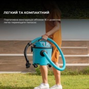 Компактная конструкция объемом 16 л позволяет легко перемещать пылесос и с комфортом проводить уборку благодаря его невероятной легкости и портативности.