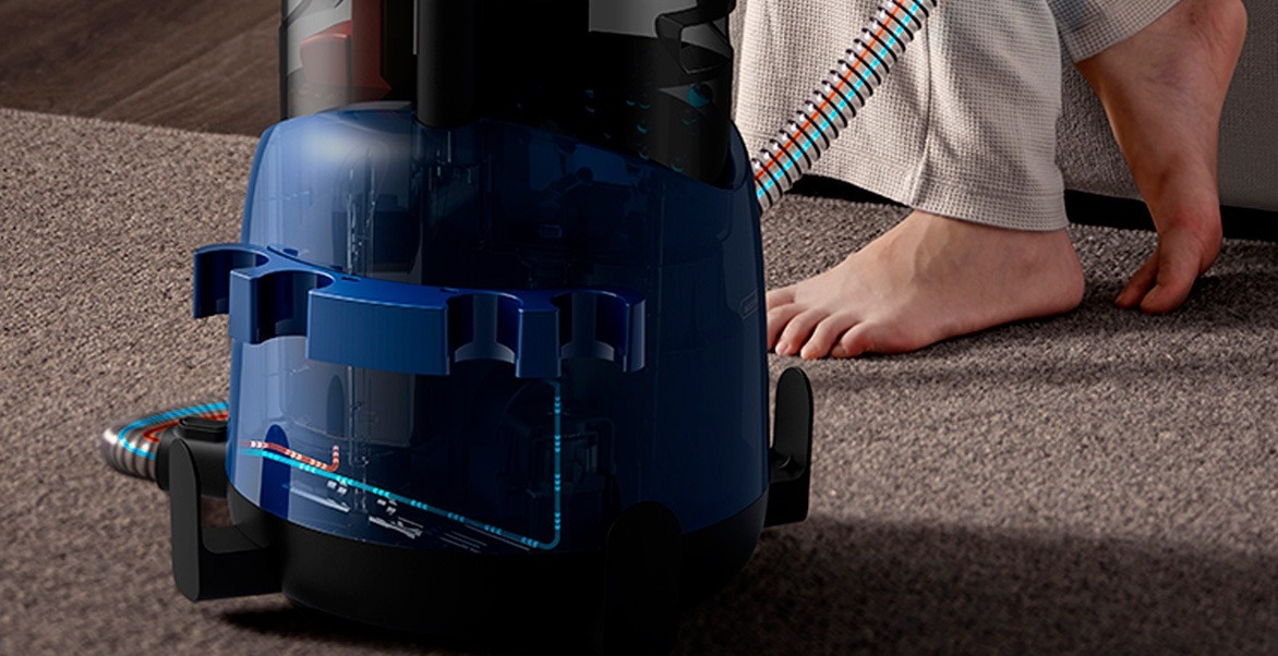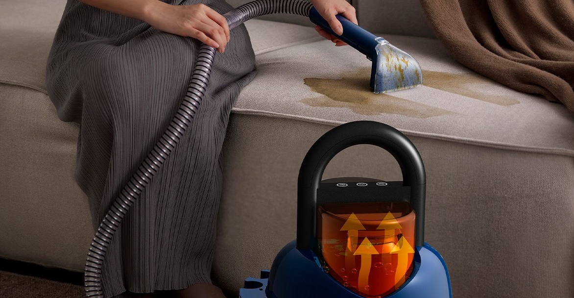 Комбинация очистки горячей водой и сильной силы всасывания позволяет избавляться от стойких пятен без лишних усилий. Прибор распыляет горячую воду под давлением, очищает ткань с помощью механического воздействия щеткой и эффективно всасывает грязную воду для быстрого высыхания. Для нагрева воды используют тепловую систему PTC. Встроенный датчик температуры NTC автоматически определяет температуру воды для стабильного циркулирующего нагрева и эффективного растворения грязи.