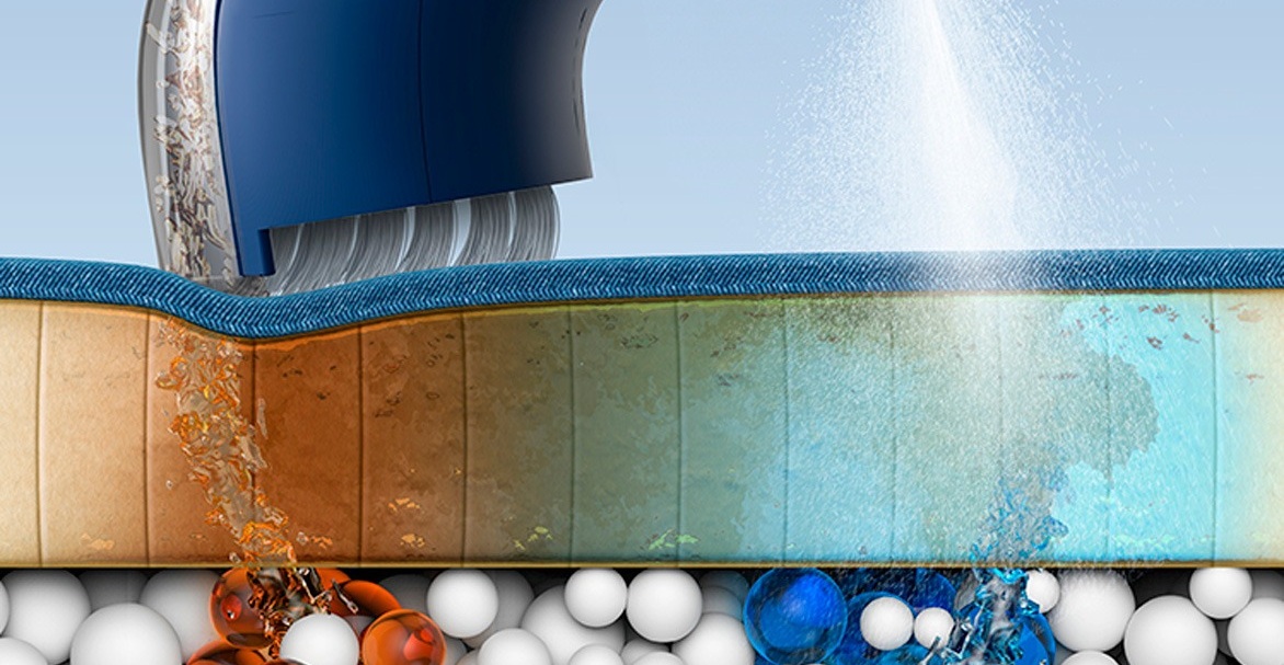 Распыление воды под давлением в 1 бар позволяет очищать загрязнения в глубоких слоях ткани. Щетка с высокой плотностью щетинок позволяет очищать грязь из промежутков между волокнами ткани.
