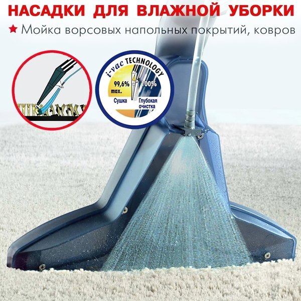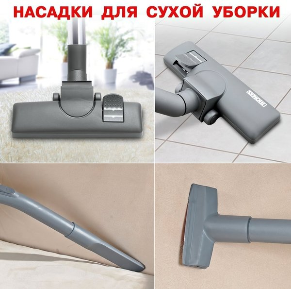 | Насадки | Для влажной уборки ковров с адаптером для твёрдых поверхностей, Для влажной уборки мягкой мебели, Для мягкой мебели, Пол-ковер, Щелевая насадка |