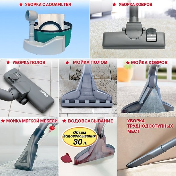 В комплект входят два фильтра - мелкодисперсный тканевый и белый вторичный к аквафильтру, а также шесть насадок для выполнения разных задач.