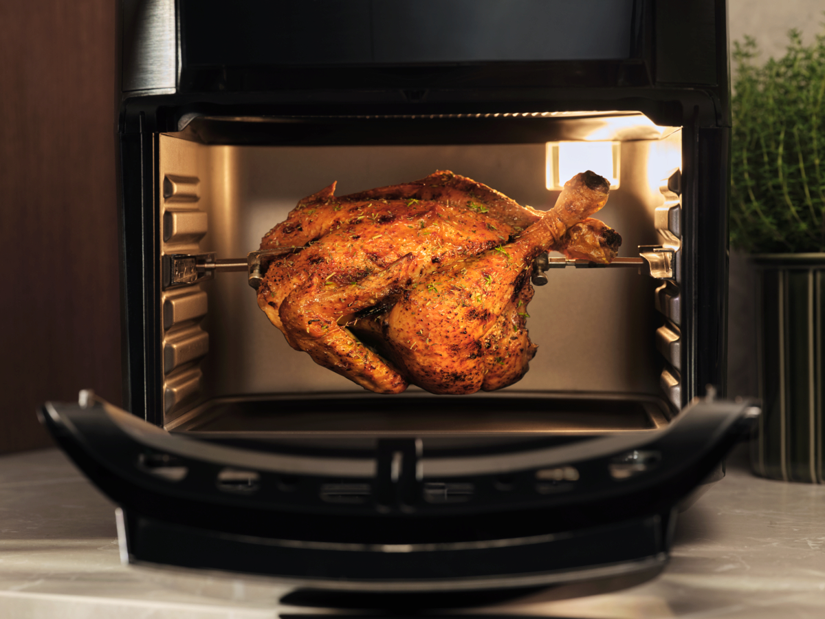 Входящий в комплект вертел равномерно вращает блюда и обеспечивает невероятный вкус таких рецептов, как сочная курица, нежный кебаб и тому подобное.