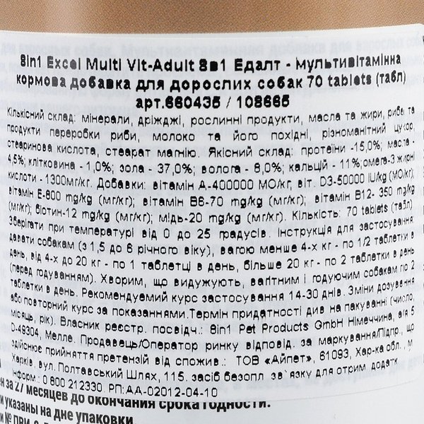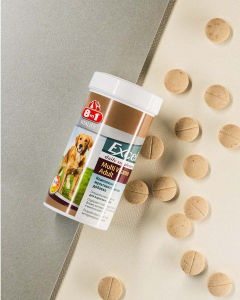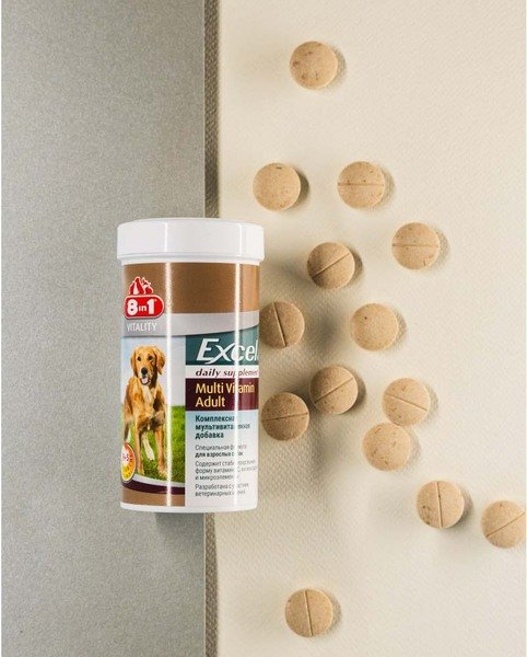 Мультивитаминный комплекс Excel Multi Vit-Adult – комплексная витаминно-минеральная добавка, специально разработанная для удовлетворения потребностей взрослых собак. Сбалансированная формула необходимых витаминов и микроэлементов помогает предотвратить проблемы, связанные с неполноценностью рациона и помогает вам сохранять собаку активной и здоровой.