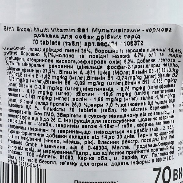 - Мультивитаминный комплекс для собак мелких пород 8in1 Excel Multi Vitamin Small Breed таблетки 70шт