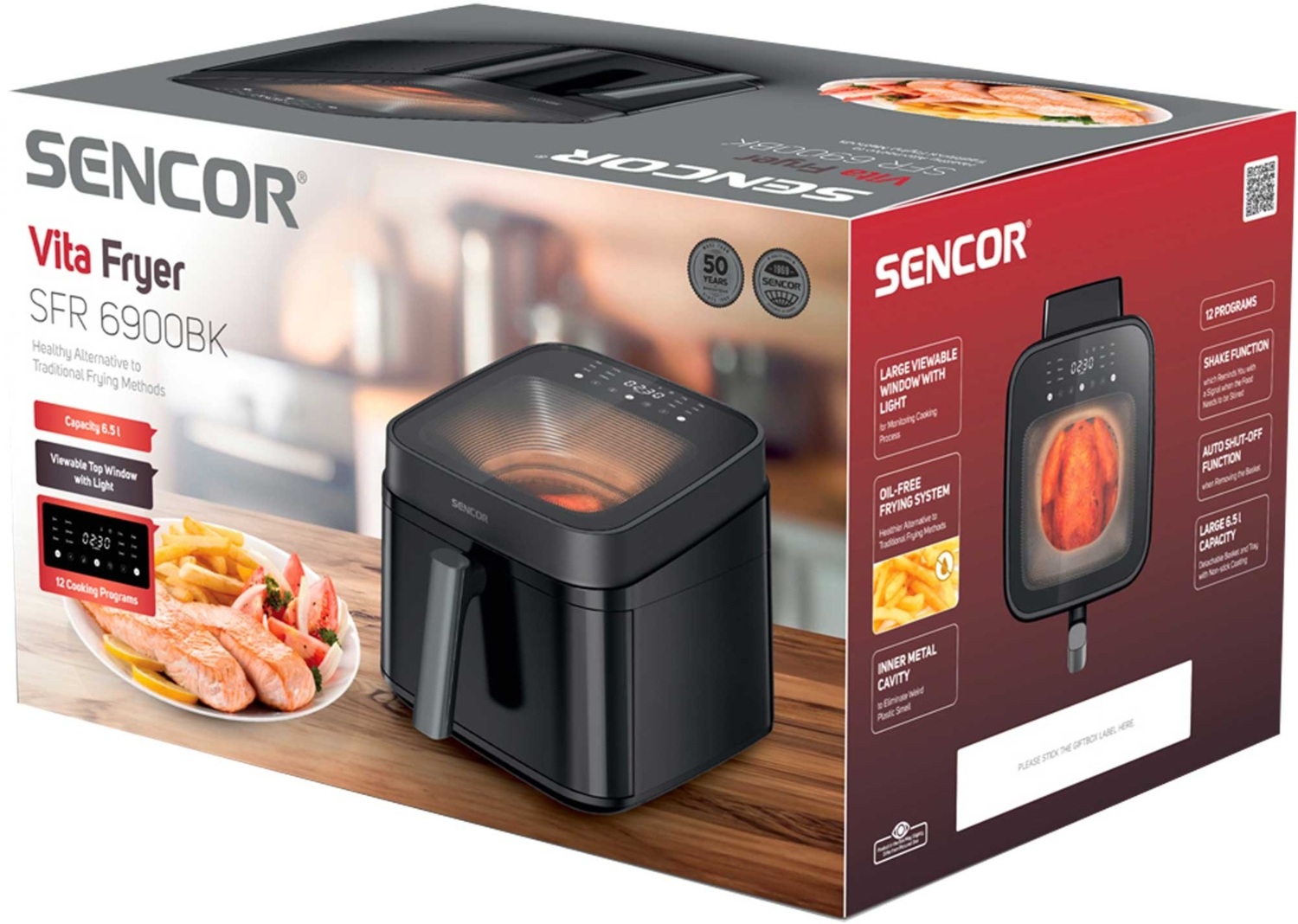Sencor Vita SFR6900BK — это современный кухонный прибор, который позволяет наслаждаться любимыми жареными блюдами без лишнего жира и вредных добавок. Он сочетает в себе инновационные технологии, большую вместимость и удобное управление, что делает процесс приготовления легким и приятным. С большой вместимостью 6,5 литров, устройство идеально подходит для приготовления пищи для всей семьи или большой компании. Вы сможете легко готовить курицу целиком, большие порции картофеля фри или овощей.
