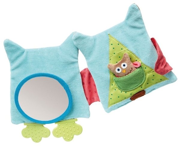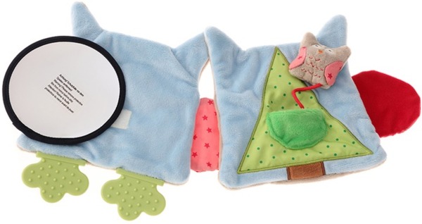 На «обложке» книги аппликация в виде совы. «Ножки» птички силиконовые, выполняют функции прорезывателя. Развернув книжечку, можно увидеть безопасное пластиковое зеркальце, кармашек с маленьким совенком. Игрушка поможет ребенку познать новые текстуры и ощущения.