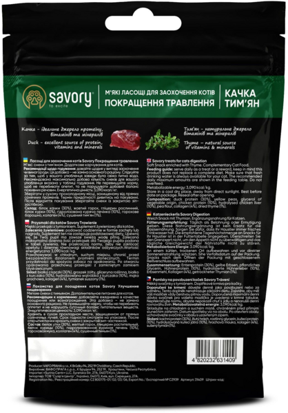 - Лакомства мягкие для котов Savory для улучшения пищеварения утка с чебрецом 50 г