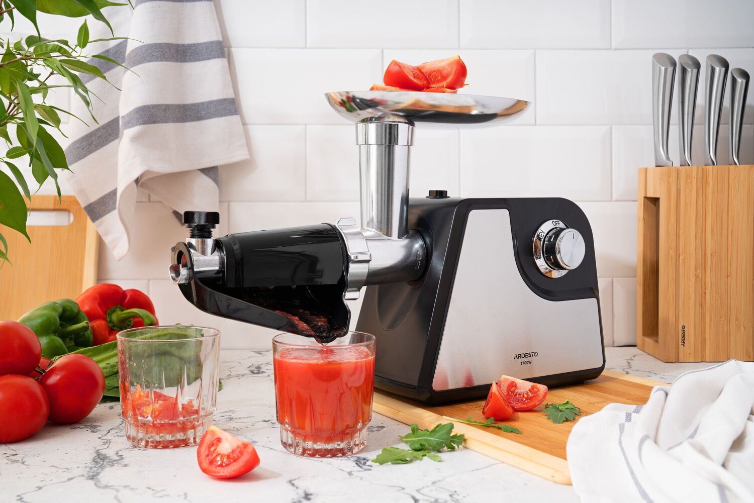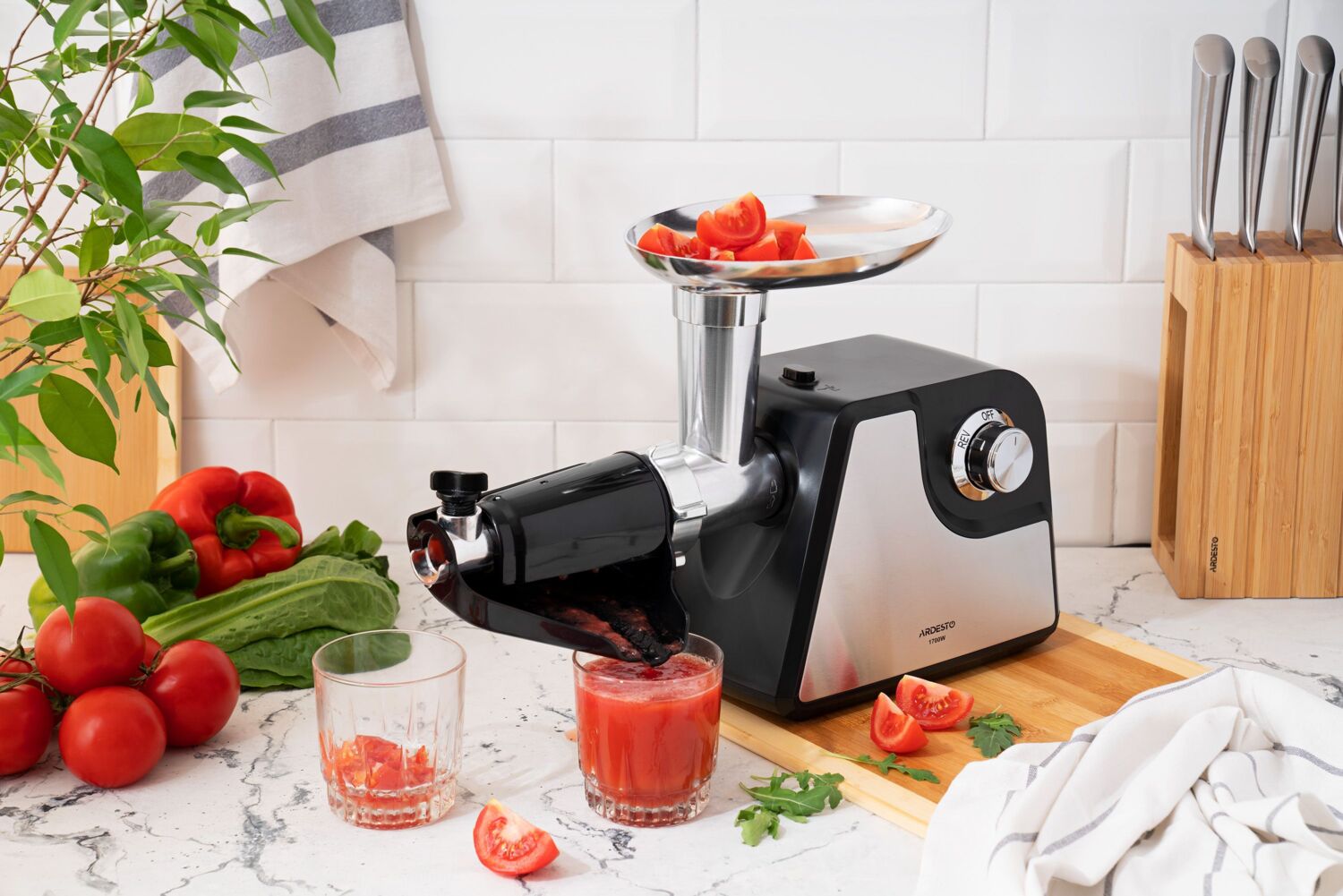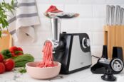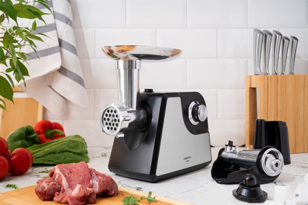 Двигатель мощностью 1700 Вт получил защиту от перегрева и функцию реверса. Базовые насадки предназначены для формирования домашних колбасок и кеббе. Насадка для отжима томатного сока состоит из нескольких частей и имеет защиту от брызг, а также механический регулятор влажности жмыха. Металлический лоток можно использовать для подготовленных ингредиентов, а толкатель ускорит процесс приготовления фарша или сока.