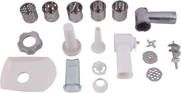 Доброго дня, Роман! В комплектацію до м'ясорубки входить: 5 барабанів для терки/шаткування, Насадка "Кеббе", Насадка для ковбасних виробів, Насадка для томатів.
